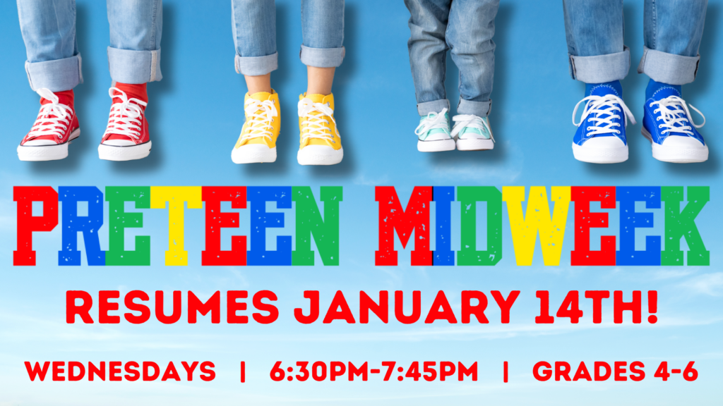 Preteen Midweek is designed for kids in 4th-6th grades to encounter Jesus! Join us Wednesdays at 6:30pm in Room 122 as preteens make friends, play games, and study the Bible together!